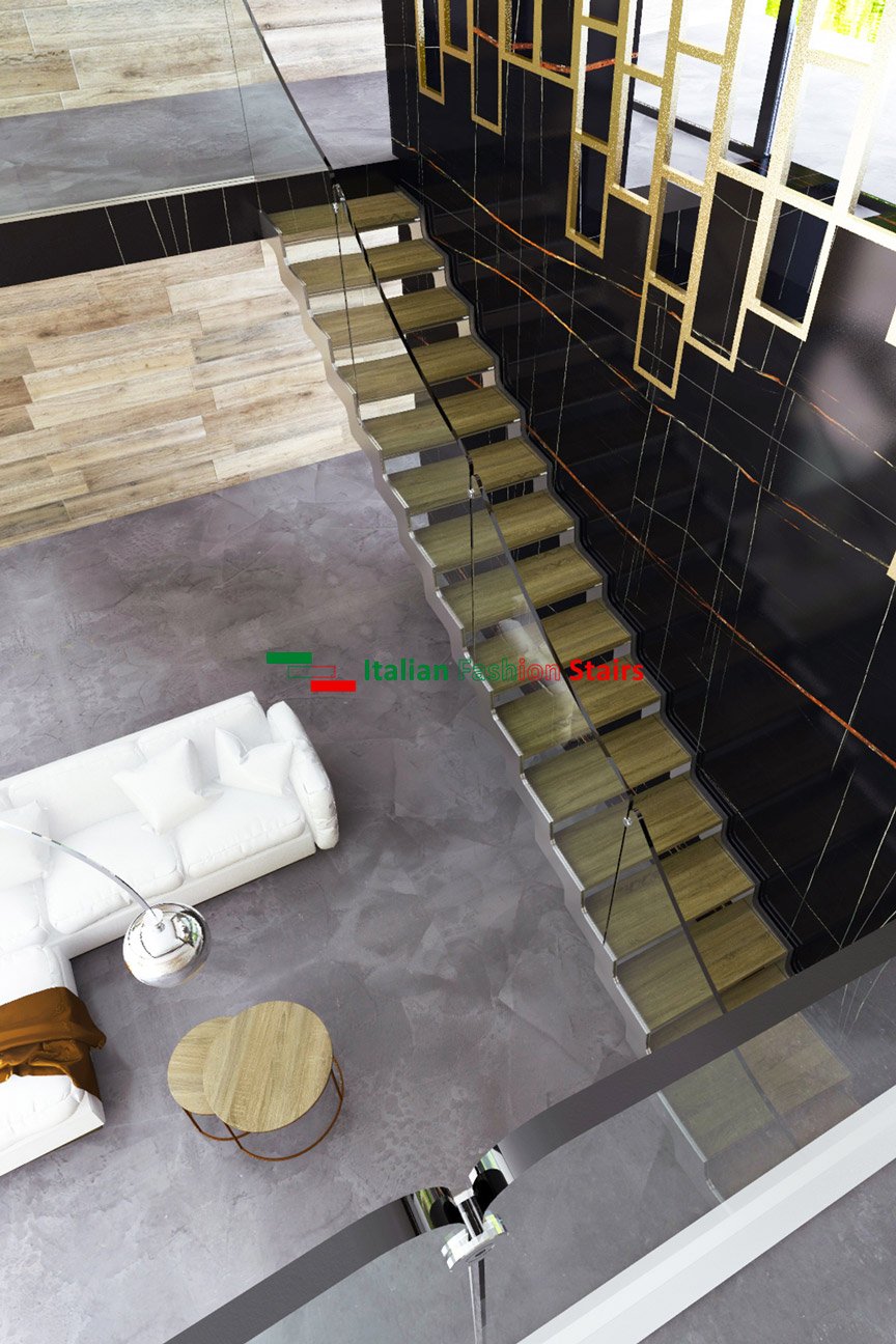 Scala composta da doppia struttura maggiorata in acciaio inox scalettata posta a fianco dei gradini, lato ringhiera in vetro, la struttura è  raddoppiata così da creare una tasca per alloggiamento della ringhiera in vetro.