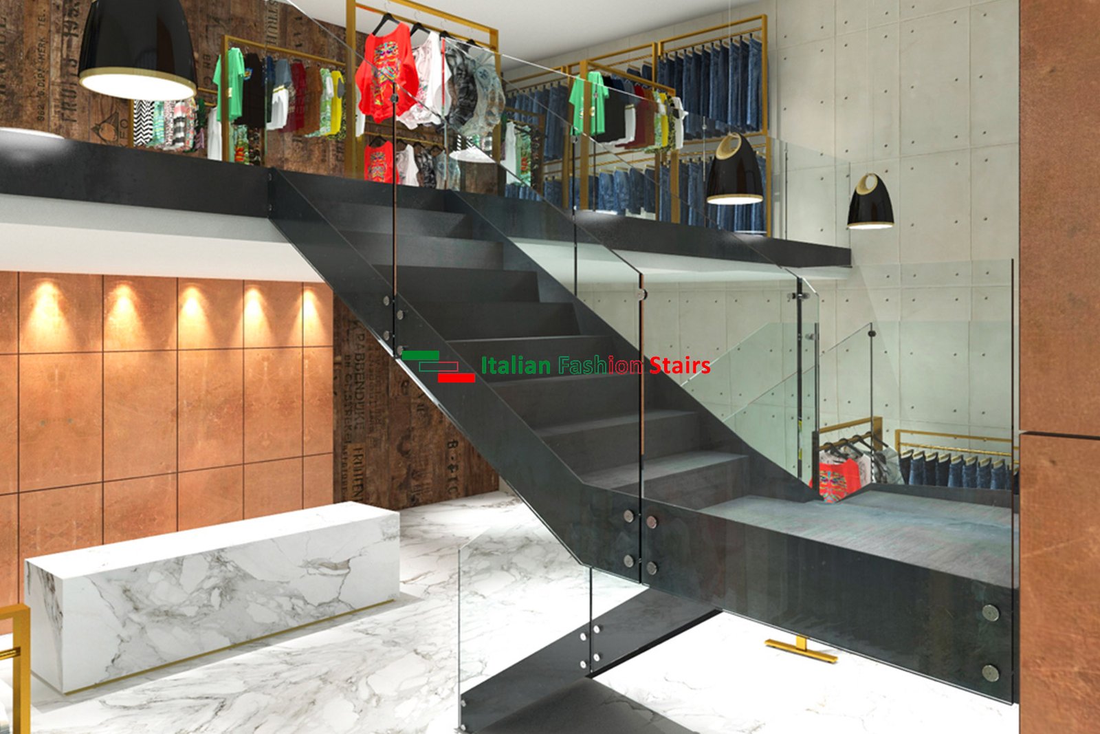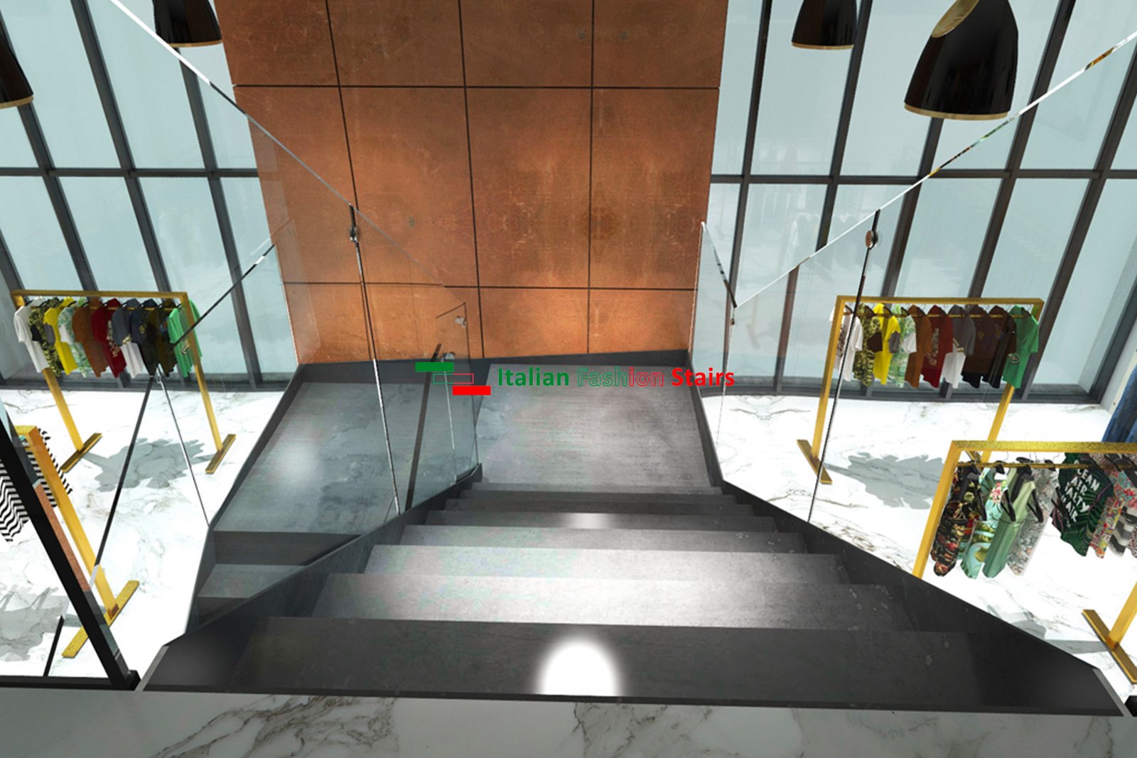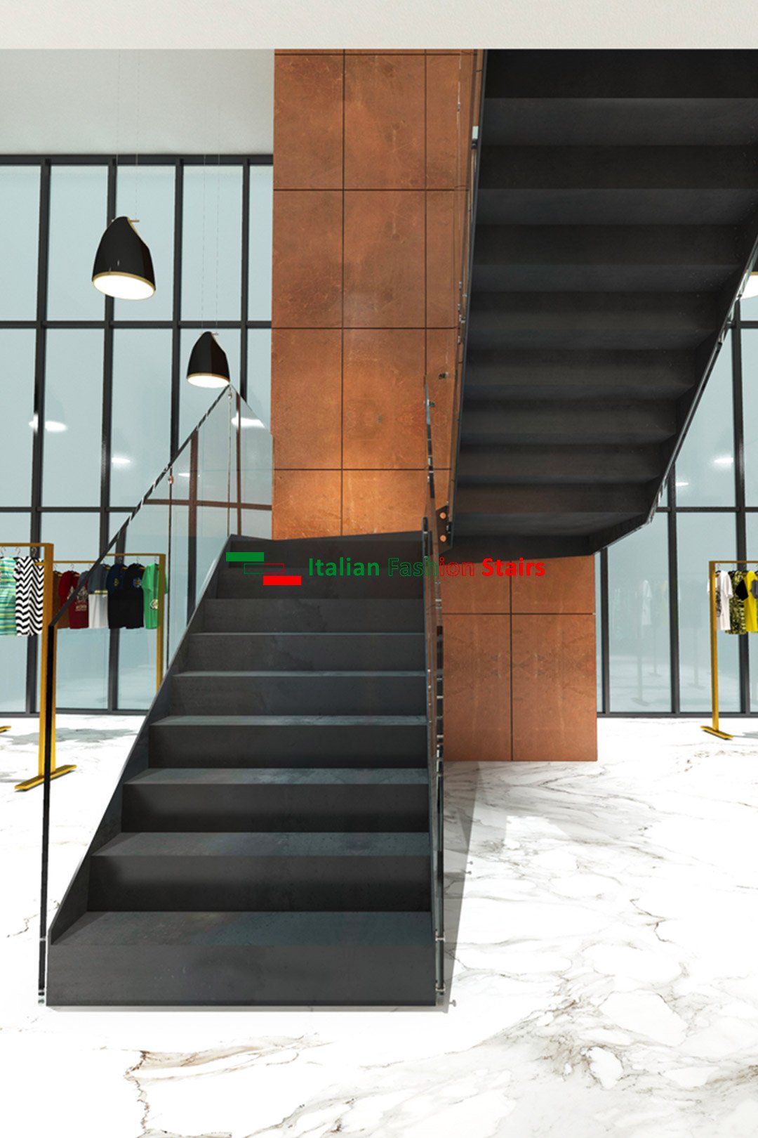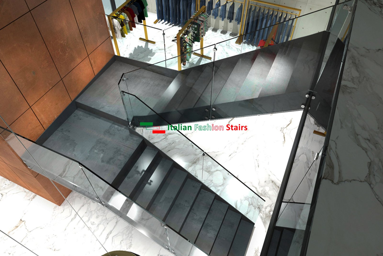 Scala a giorno doppia struttura a fascia in metallo, gradini e alzate in metallo, ringhiera in vetro spessore 10 + 10 ancorato alla struttura mediante borchie in acciaio inox.