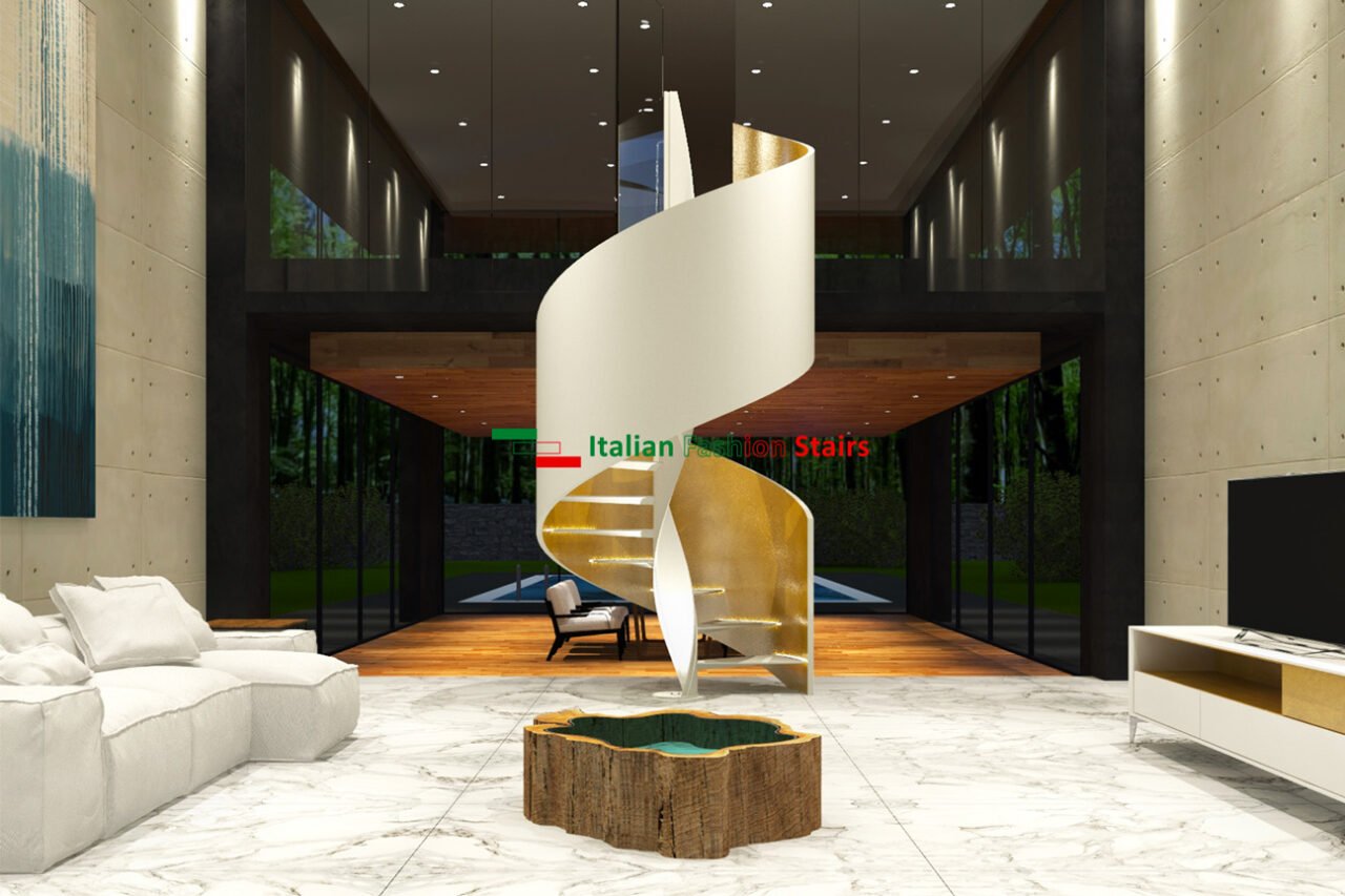 La scala elicoidale è una scala molto scenografica, elegante e fluida per la sua forma ellittica. La scala elicoidale ha due eliche, una interna ed una esterna. I gradini si sviluppano all’interno delle eliche. La ringhiera ellittica può essere realizzata in metallo, acciaio inox o pannelli di vetro strutturale. I gradini possono essere realizzati in legno massello, in metallo o in vetro. La ringhiera può essere prodotta in molteplici varianti per meglio adattarsi nell’ambiente. Scala da realizzarsi su misura con finiture personalizzabili.