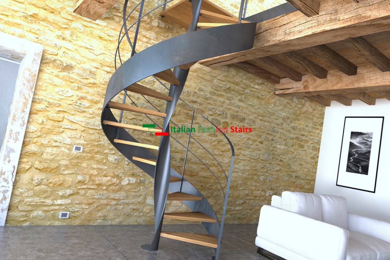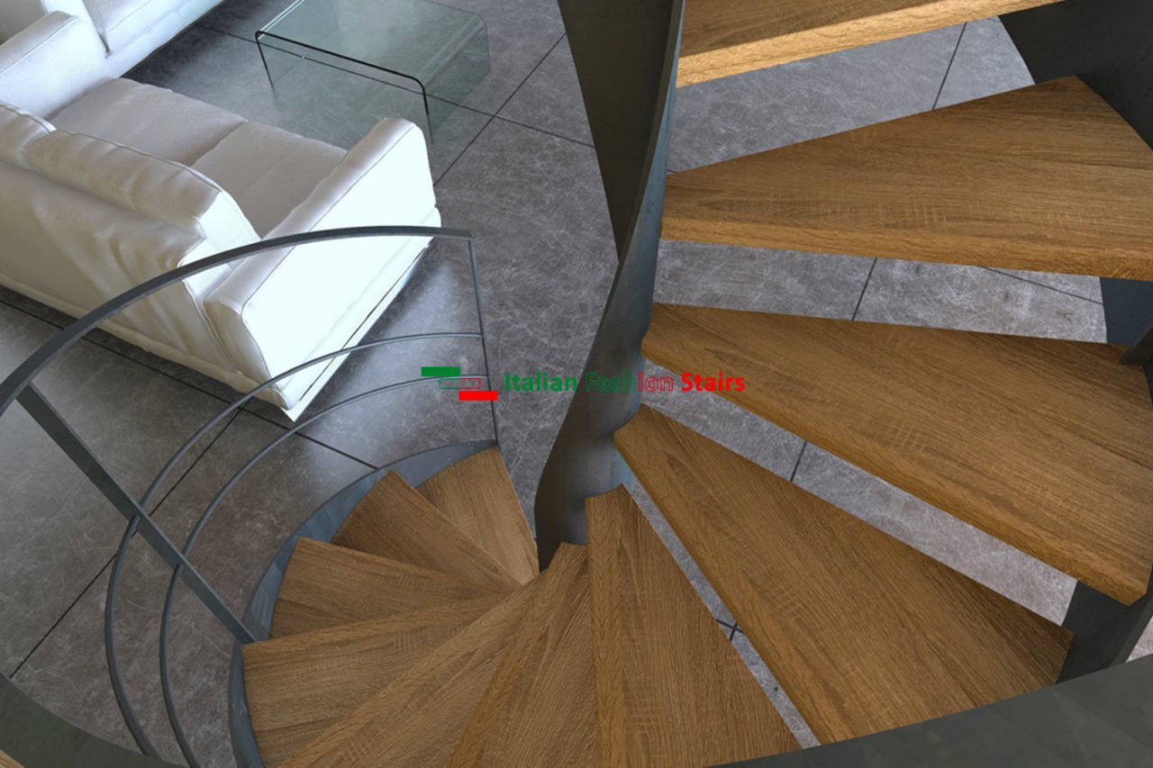 Scala elicoidale  composta da struttura in metallo, gradini in legno,  ringhiera in metallo.